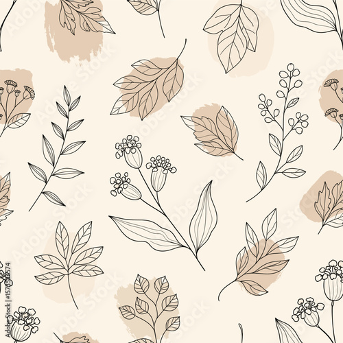 Seamless Wild Botanical Pattern - Minimalist Leaves & Vines - Earthy Hemp Hand-Drawn Line Art - Textile Design