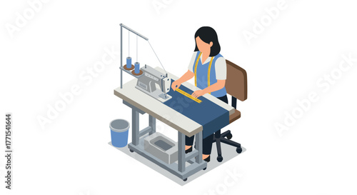 Seamstress sewing clothes in isometric design at workstation
