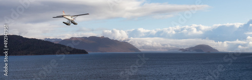 Seaplane Aircraft Flying over the Pacific Ocean Coast. Cloudy morning Colorful Sky. 3d Rendering Adventure Dream Concept Artwork. Background Nature Image from Glacier Bay National Park, Alaska.
