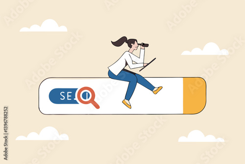 Search box, SEO search engine optimization or finding website from internet, online job or career opportunity concept, woman working with computer laptop on search box with magnifying glass button.
