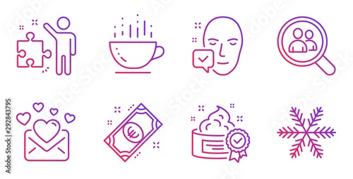Search employees, Coffee cup and Cream line icons set. Love mail, Face accepted and Euro money signs. Strategy, Snowflake symbols. Staff analysis, Hot drink. Business set. Vector