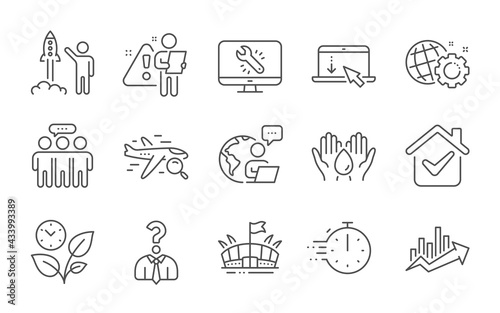 Search flight, Cooking timer and Leaves line icons set. Employees group, Growth chart and Arena signs. Scroll down, Hiring employees and Monitor repair symbols. Line icons set. Vector