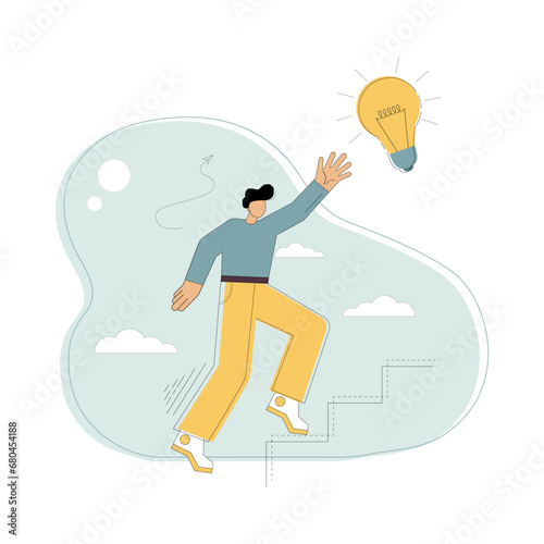 Search for an idea. Pursuit of a dream. Moving up the career ladder. A man walks up the stairs and reaches out to a light bulb, an idea.