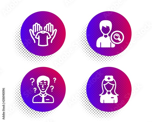 Search people, Hold t-shirt and Support consultant icons simple set. Halftone dots button. Hospital nurse sign. Find profile, Laundry shirt, Question mark. Medical assistant. People set. Vector