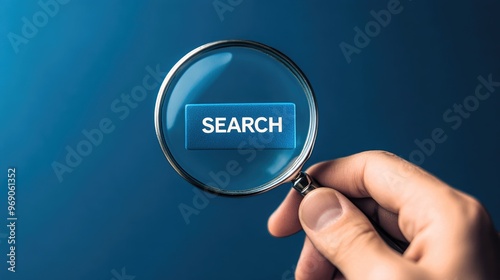 Search word through a magnifying glass. Magnifying glass search concept, on blue background.
