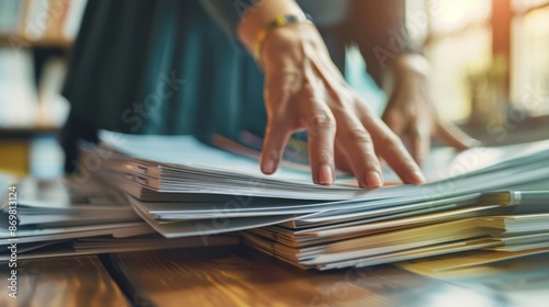 Searching for documents. Close-up of a person's hands searching through a stack of paperwork on a desk, suggesting a busy office environment or administrative tasks.