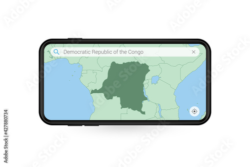 Searching map of DR Congo in Smartphone map application. Map of DR Congo in Cell Phone.