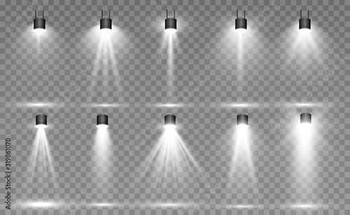 Searchlight collection for stage lighting, light transparent effects. Bright beautiful lighting with spotlights.