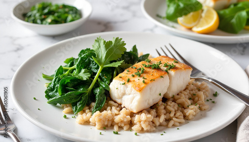 Seared fish with sautéed greens and rice on white plate