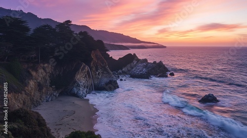 Seascape view of a beach with mountains and a waterfall during sunset at purple hour
