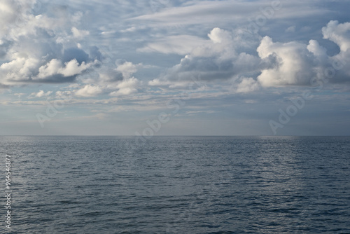 Seascape with blue sky and white clouds over the sea. Beautiful seascape with clouds in the sky over the sea. Nature composition.