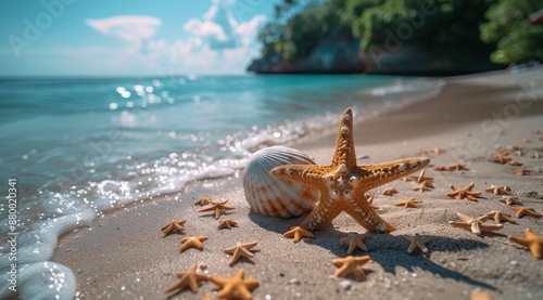 Seashell and Starfish on Sandy Beach with Ocean Waves Photo