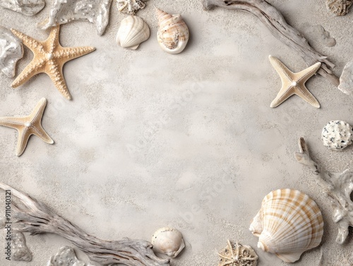 Seashell with starfish and sand dollar with driftwood on sandy texture desk with empty space in the center top view.