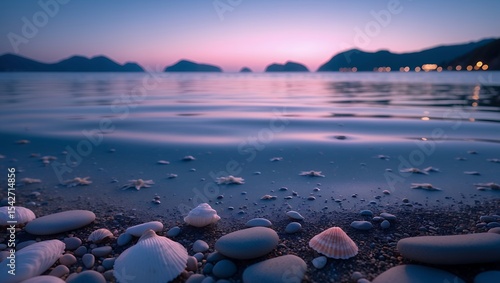 Seashells and Pebbles on Shoreline with Water Reflecting Twilight Sky