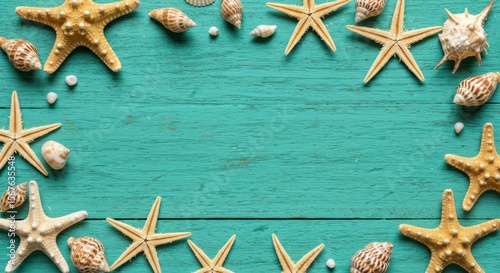 Seashells and starfish arranged on a teal wooden background, creating a summery frame