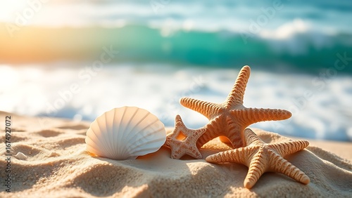 Seashells and starfish on sand, evoking tranquility of a tropical beach.
