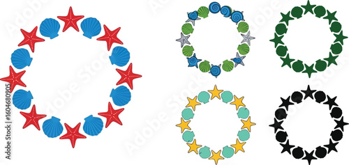 Seashells and starfish vector wreaths for summer designs and beach themed invitations templates