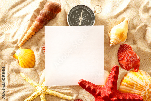 Seashells, compass and paper on sand