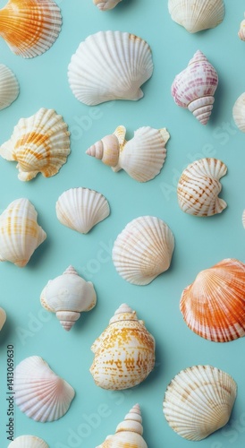 Seashells marine ocean treasures natural summer collection on blue surface