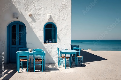 Seaside Cafe Serenity: The sun casts its radiant light on the inviting blue-painted cafe furniture, creating a tranquil scene beside the boundless ocean.