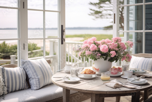 Seaside Cottage Dining, Ocean Breeze, Pastel Floral Centerpiece with Oceanfront View