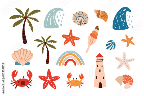 Seaside Paradise Collection: A vibrant collection of beach-themed illustrations featuring essential elements. Capturing the spirit of summer, perfect for enhancing any project