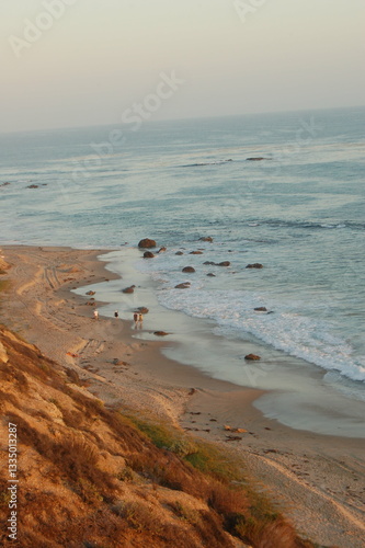 Seaside Serenity: Capturing the expansive vista of a stunning beach, the golden sands meet the tranquil, aquamarine waters, evoking a sense of calm and the allure of the open sea.