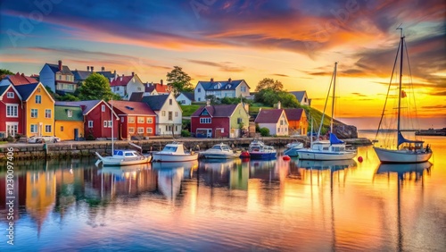 Seaside village at sunset with colorful buildings and sailboats, beachy, idyllic, summer