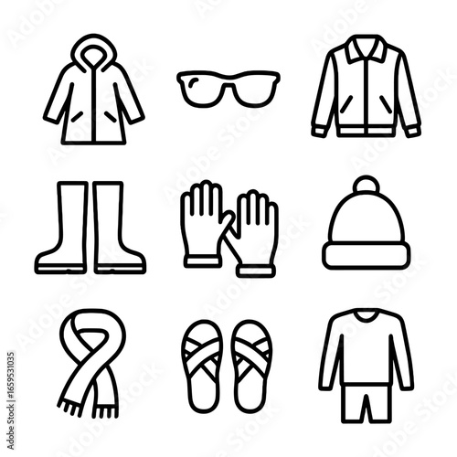 Seasonal Clothing Icons. Outline icon set of seasonal clothing: raincoat, sunglasses, jacket, boots, gloves, hat, scarf, sandals,