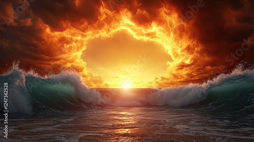 Seasonal Electric Storm Fury by Dramatic sunset over turbulent ocean waves.