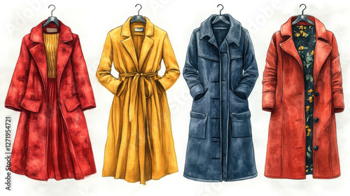 Seasonal fashion illustration showing flowy summer dresses, chunky fall sweaters, and sleek winter coats