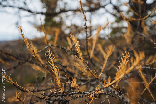 Seasonal larch branch analysis, Rustic scene depicting botanist examining autumnal tree textures, Serene nature scene capturing botanist studying seasonal changes in tranquil forest setting