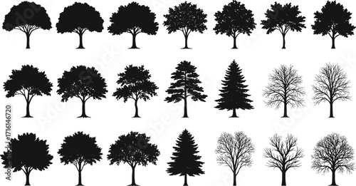 Seasonal tree silhouette collection in black vector style, botanical illustration set, nature concept, isolated design for educational artwork use