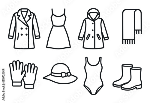 Seasonal wardrobe linear icon set. clothing and fashion essentials symbols