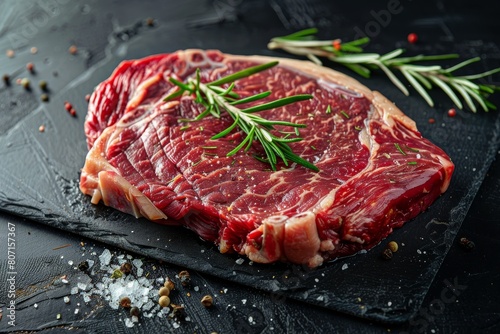 Seasoned Angus beef rib eye steak ready for grilling on dark surface Fresh meat