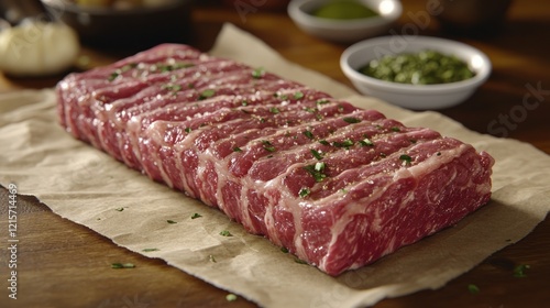 Seasoned steak, kitchen prep, herbs, wood, cooking