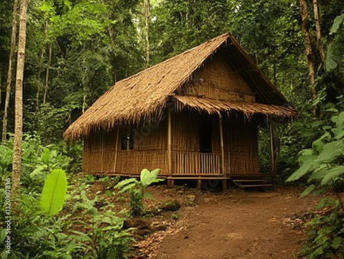 Secluded bamboo hut nestled within lush greenery of tropical forest