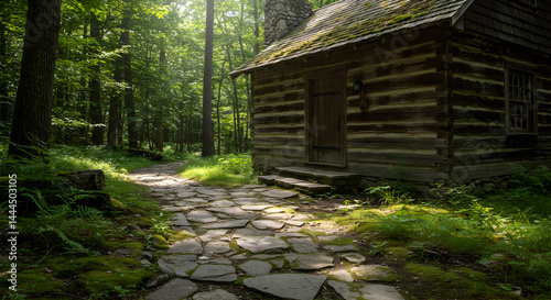 Secluded Cabin Retreat In Lush Forest On Stone Path On Sunny Day