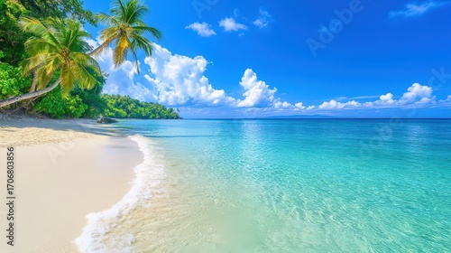 Secluded tropical beach with crystal-clear water lush