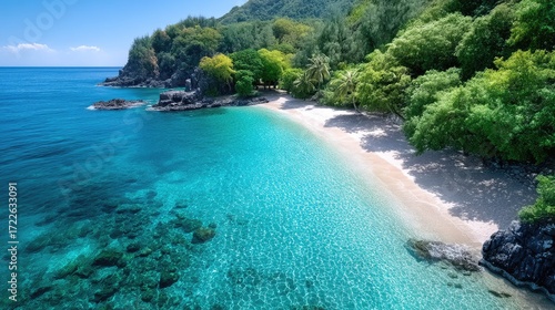 Secluded Tropical Beach with Turquoise Water and Lush Greenery Aerial View Coastal Paradise Sunny Day Natural Beauty Relaxation Destination White Sand