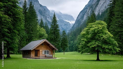 Secluded Wooden Cabin nestled in a lush green valley surrounded by majestic mountains A perfect tranquil escape