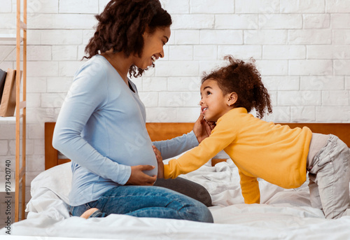 Second Pregnancy. Cute African American Daughter Touching Mother's Pregnant Belly Waiting For Little Brother Or Sister Sitting On Bed Indoor
