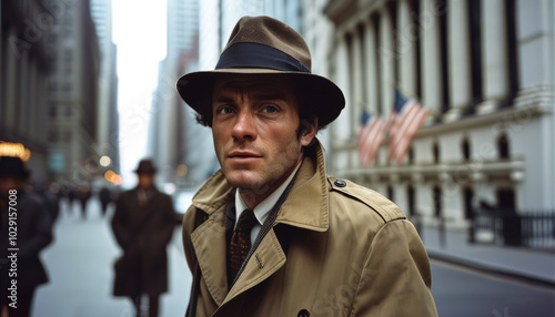 Secret agent in a trench coat tailing a target in a 1960s urban setting