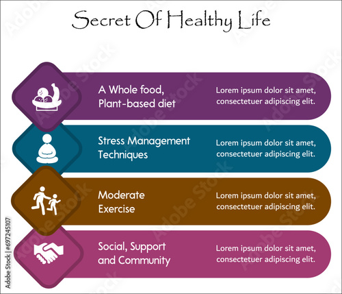 Secret of Healthy Life - A whole food, plant-based diet, Stress management techniques, Moderate exercise, Social, Support and community. Infographic template with icons