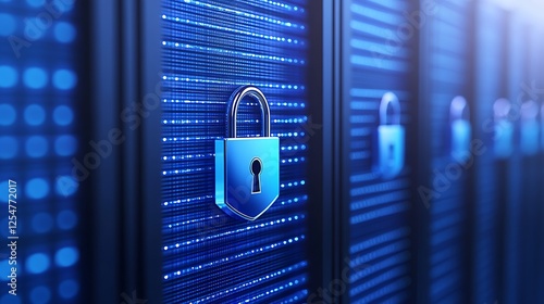 Secure Data Storage with Blue Padlock on Digital Server Background Representing Cybersecurity and Protection