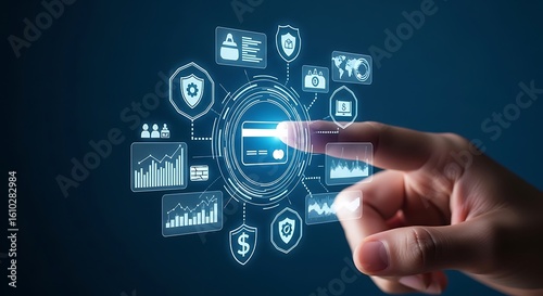 Secure online payments and financial technology concept with credit card and data analysis represented by glowing digital interface and human touch
