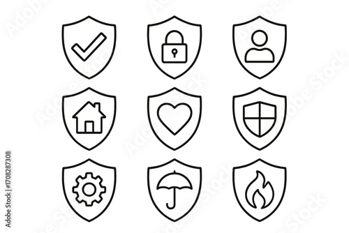 Security and insurance vector line icon set. Shield symbols for protection, safety, and guarantee concepts. Includes home, health, fire, data privacy, and user protection.