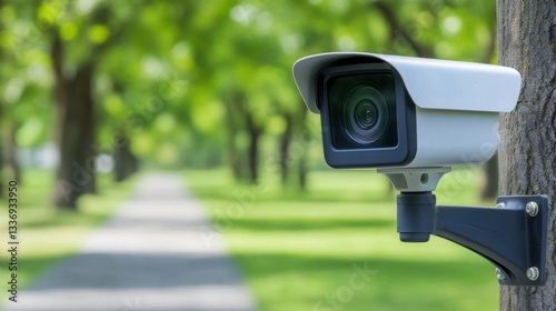 Security camera mounted on a tree, overlooking a blurred park pathway, ensuring public safety and monitoring activities.