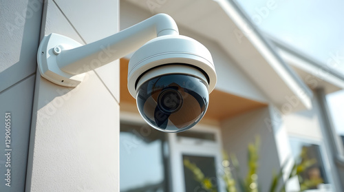 Security camera mounted on house exterior. Modern home in background. Surveillance tech protects property. Home safety equipment on building wall. Exterior shot shows home protection system. Advanced