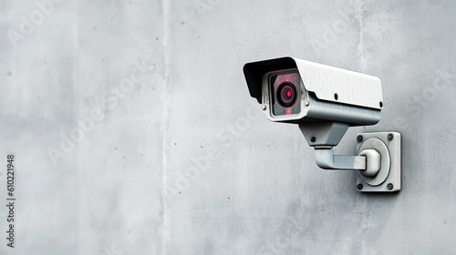 Security camera on concrete wall with copy space. Postproducted generative AI illustration.